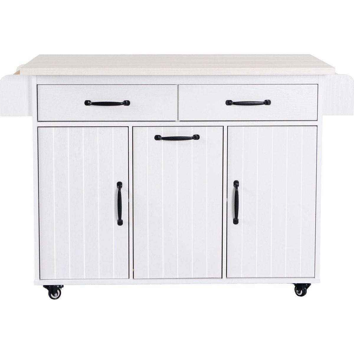 | Summary | This kitchen island brings significant savings to your cooking space and indoor storage. Constructed from P2 Grade Particleboard, stripes on the cabinet doors give it an attractive look. The multipurpose tilt-out trash can it carries is a great feature of the product, with two drawers, two cabinets, and a spice rack and towel rack, your kitchen essentials will no longer be cluttered. The rolling kitchen cart sits on lockable casters for easy mobility and stability. The thoughtfully designed drop leaf can be opened and folded. In addition, there are adjustable shelves for your flexible storage needs. |