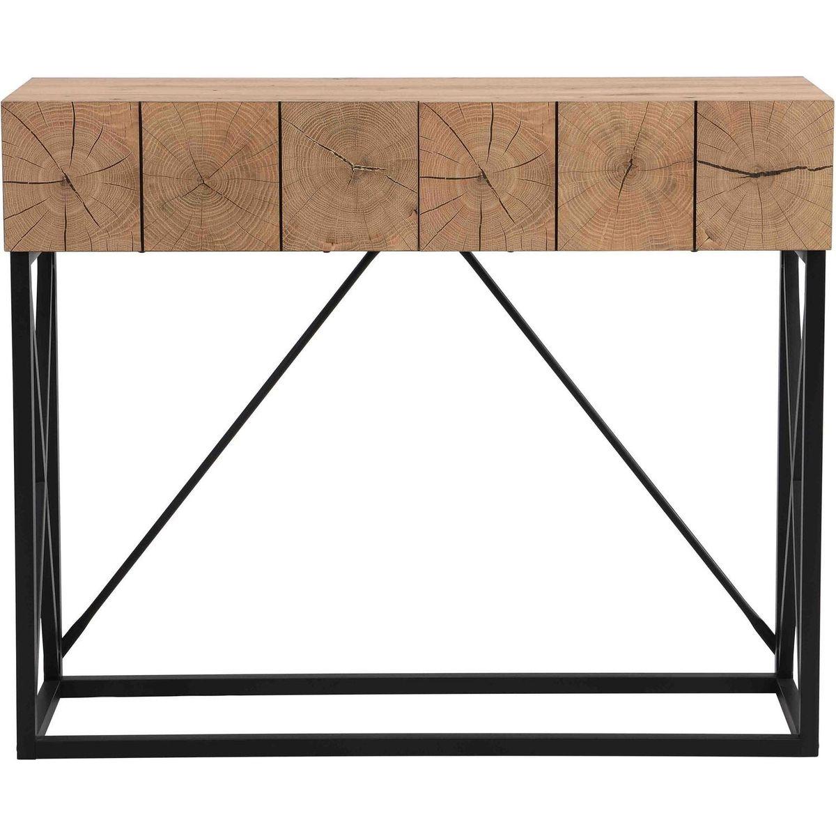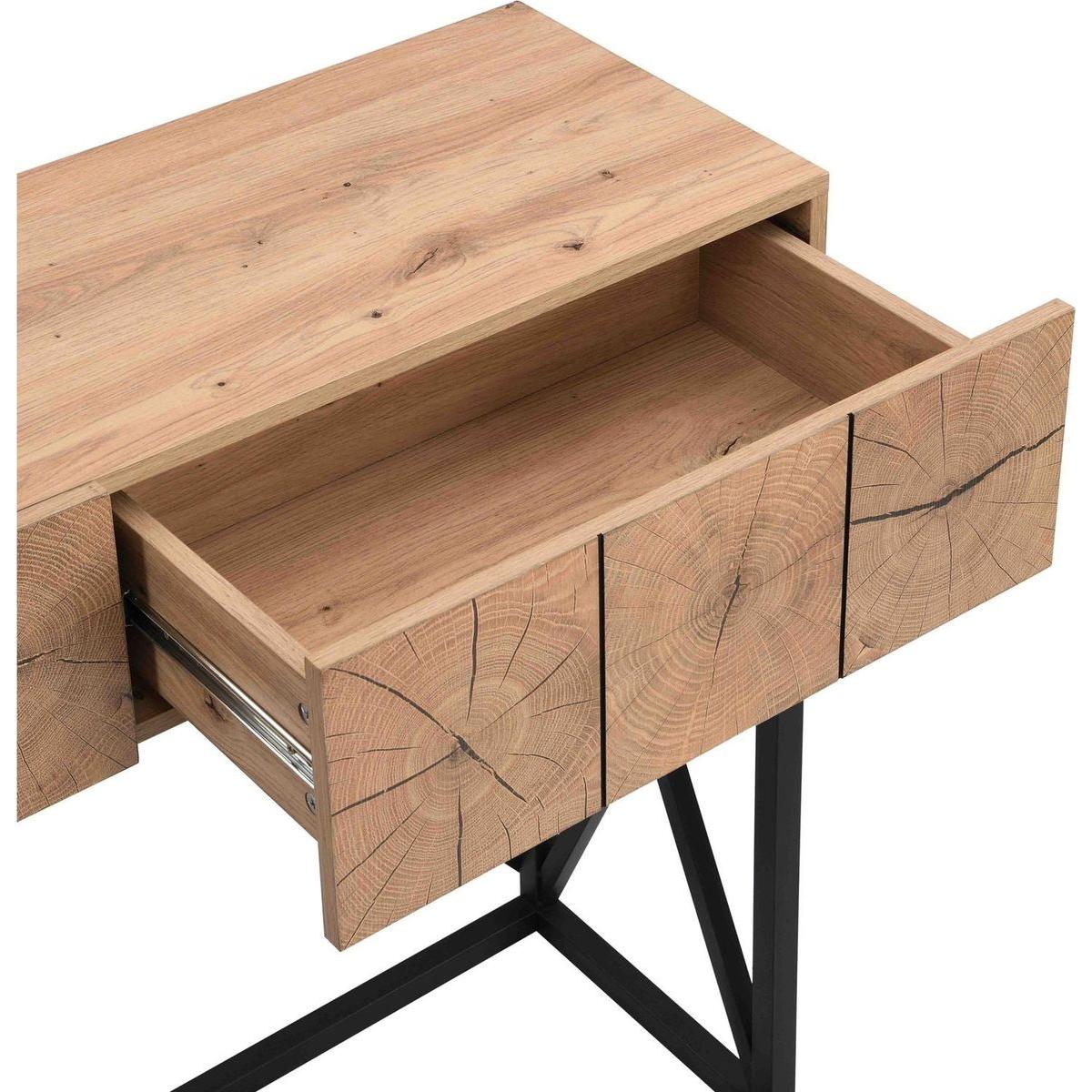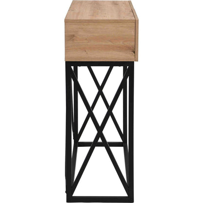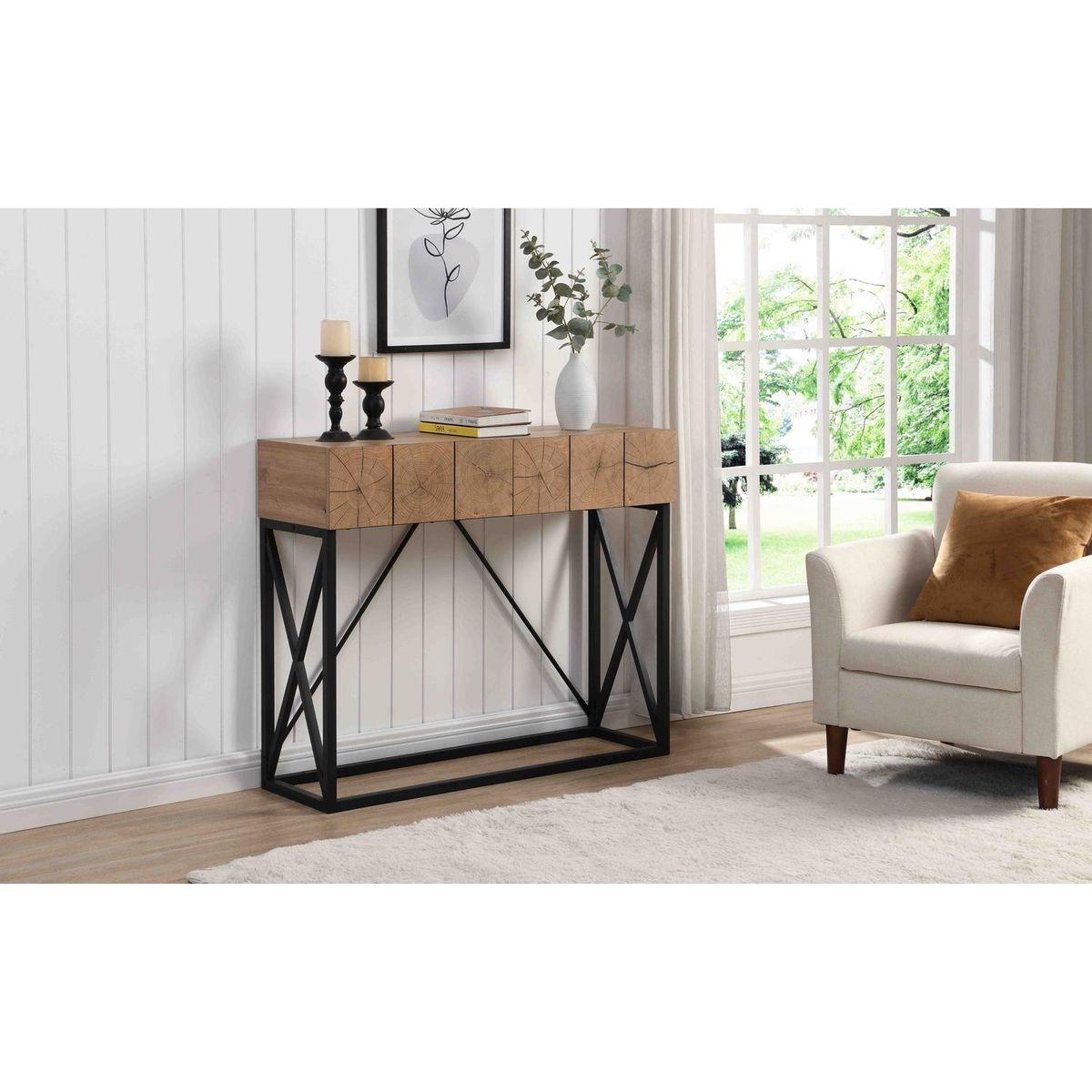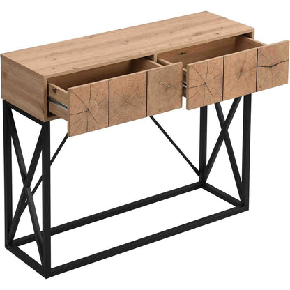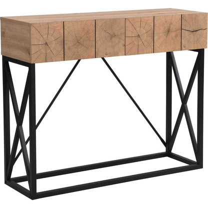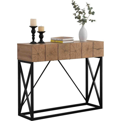 - 3. Ample Storage Space: The table top is ideal for putting plenty things like books and decorative plants. While the two drawers can put wallets, keys, and other small items. offering ample storage space to keep your living area tidy and clutter free. It keeps clutter out of sight while lending a touch of industrial-chic look and classic beauty to your space, creating a welcoming atmosphere in your entryway.