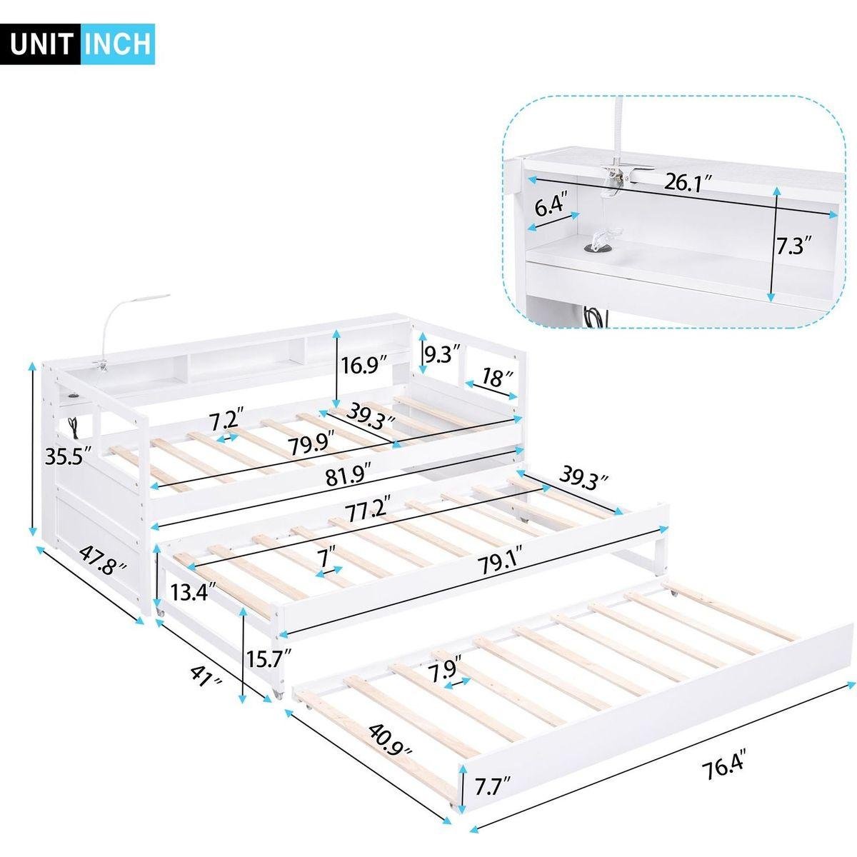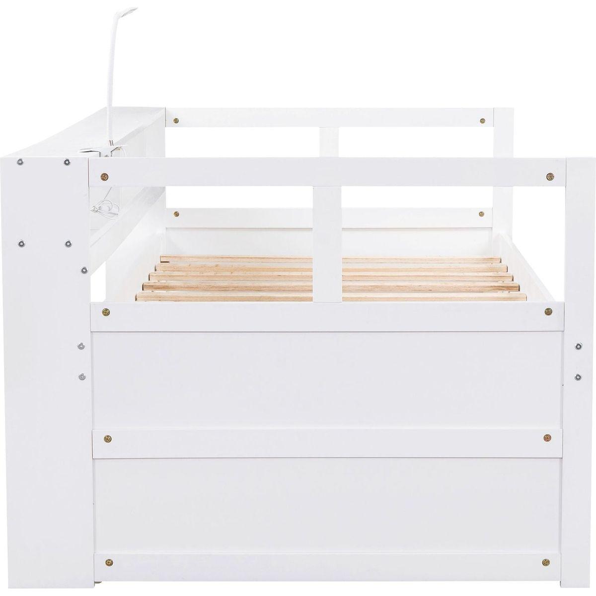Twin XL Wood Daybed with 2 Trundles, 3 Storage Cubbies, 1 Light for Free and USB Charging Design, White