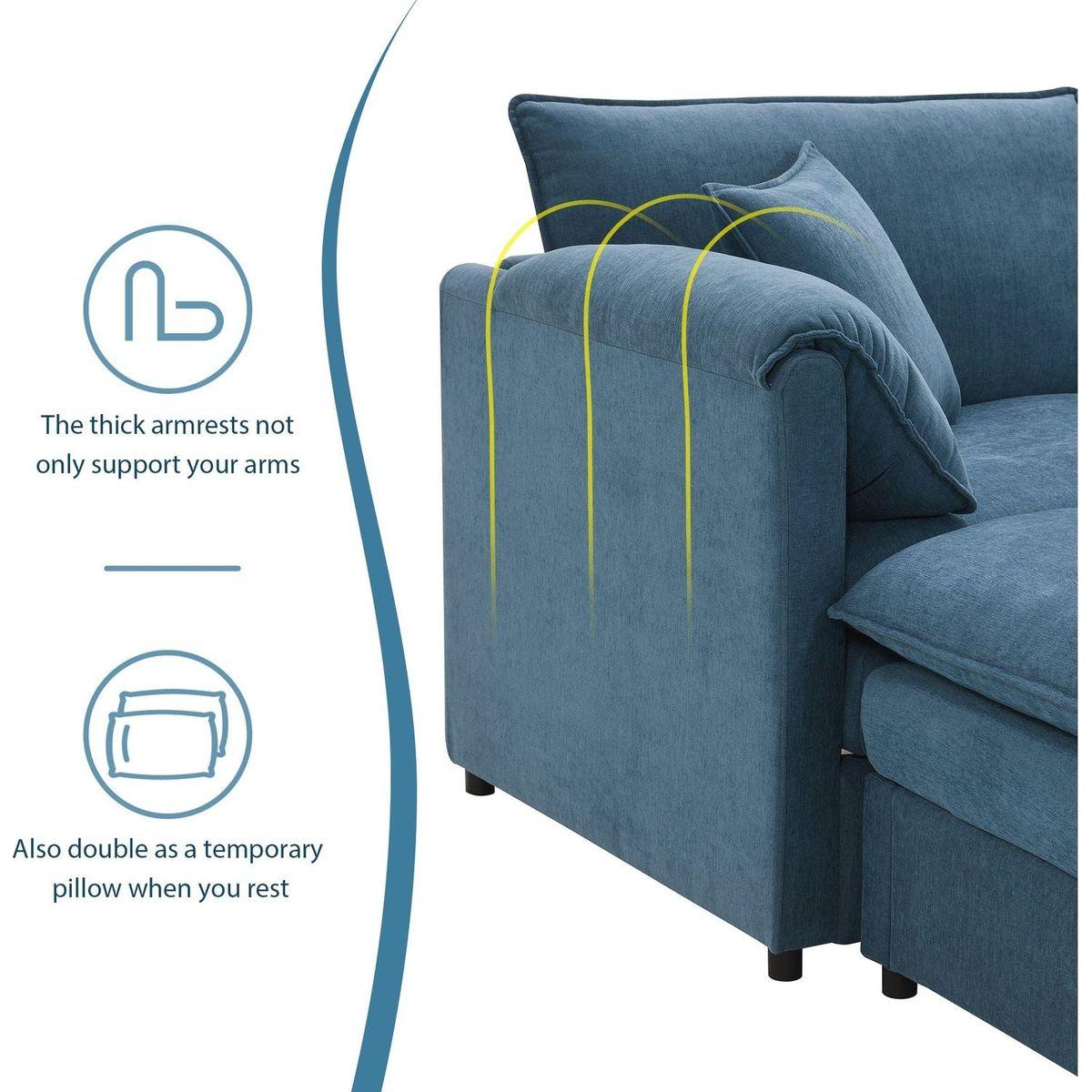 The sofa with double cushions, extra-wide seating, two removable ottomans, and armrest pillows on both sides offers the benefits of enhanced comfort, ample seating space, versatility, and convenient relaxation. Additionally, it boasts a stylish design that complements any interior decor.