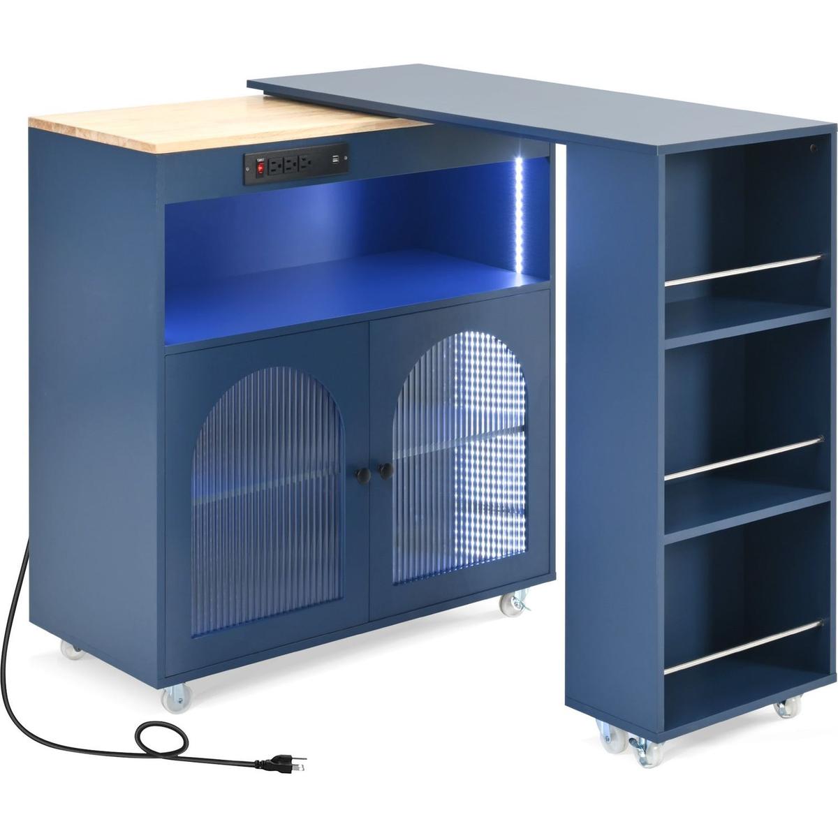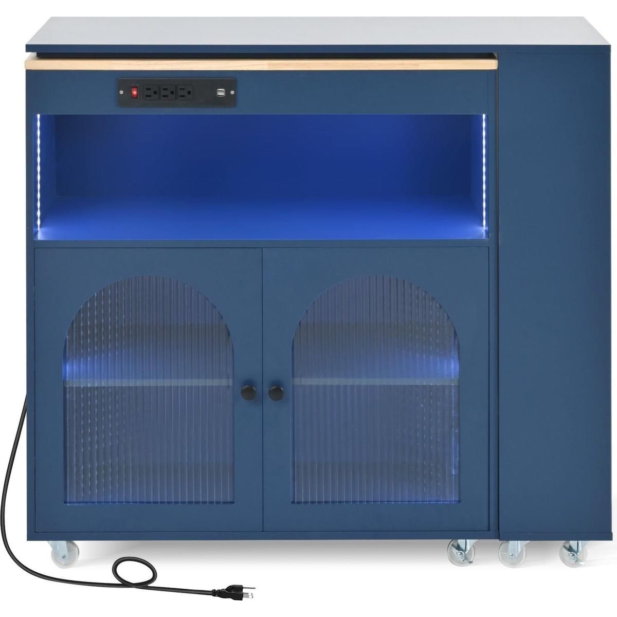 Rolling Kitchen Island With Movable Extended Table, Kitchen Cabinet on Wheels with Power Outlets and 2 Fluted Glass Doors, Kitchen Island with a Storage Compartment and Side 3 Open Shelves, Navy