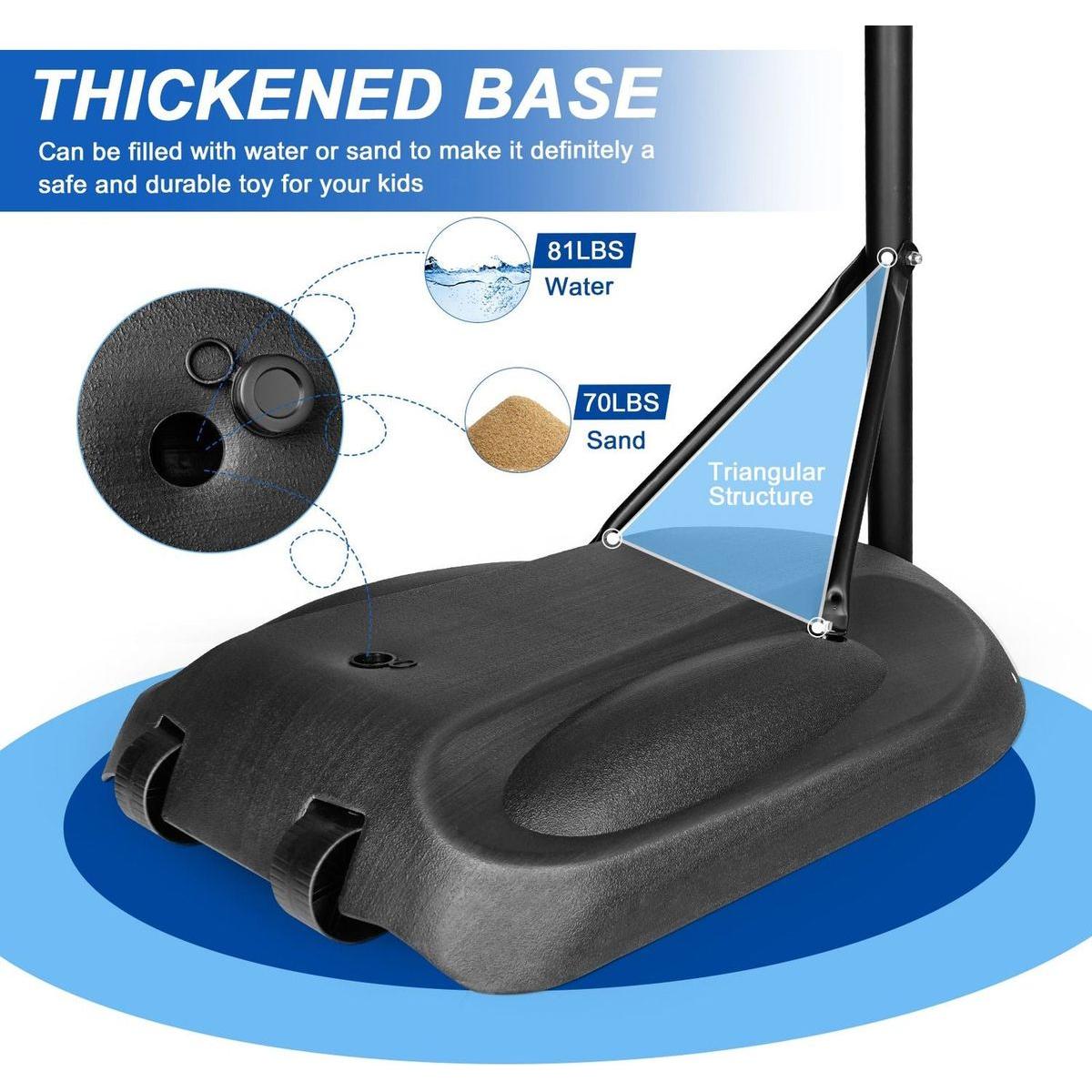- [DURABLE AND SOLID BASE] It is designed with a solid and sturdy basketball base. The basketball goal's triangular stable base (32" * 23" * 6.3") can be filled with 77LBS water or 88LBS sand, ensuring a strong and sturdy base in any case.