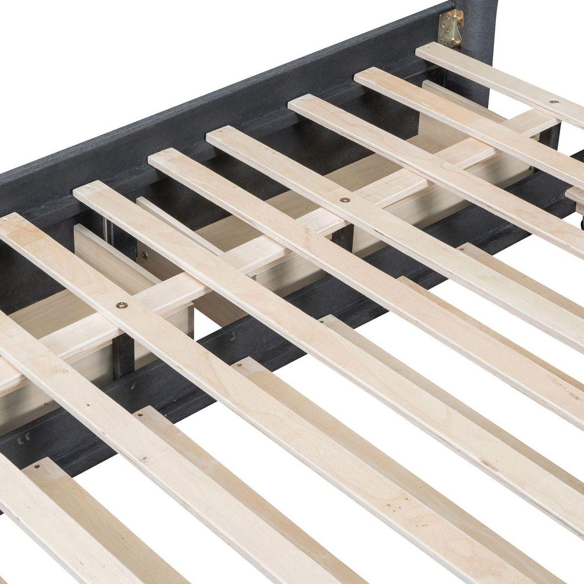 This beautiful Upholstered Platform Bed features classic headboard that adds a contemporary chic look to your bedroom and filled in thick foam to add extra comfort.Sturdy wood frame construction and a wooden slat system to add extra stability and safety. Despite its size and solidity, this piece comes with hardware and instructions included and anyone can assemble it, without a problem. The upholstered platform bed with two drawers and a large trundle can easily be pulled in and out for maximum storage space and extra sleeping area, perfect for organizing anything from clothes and bed linens to toys and games, and for sleepover.