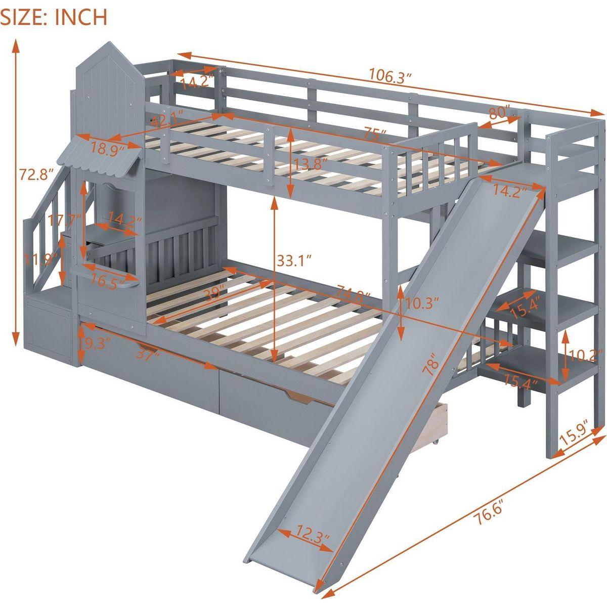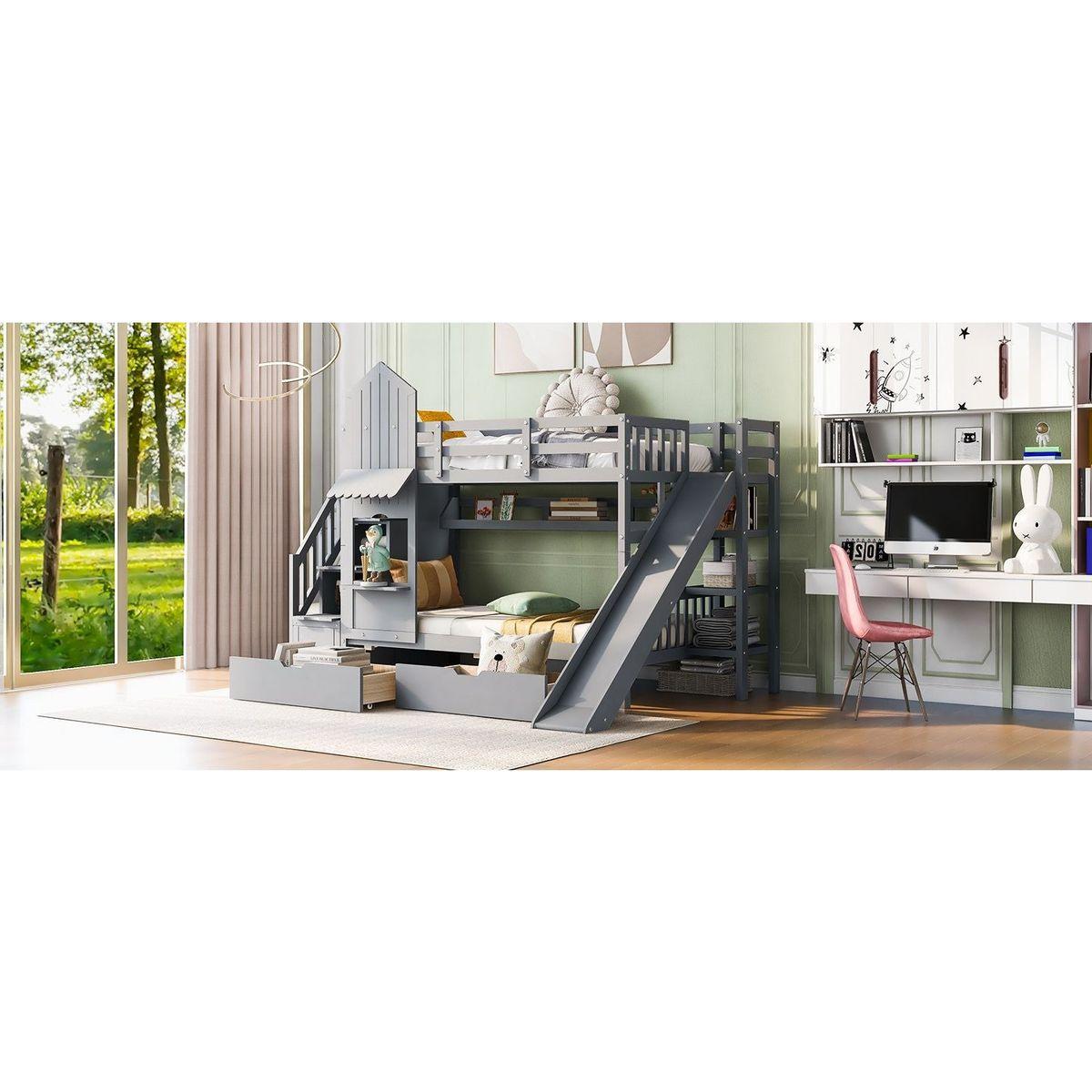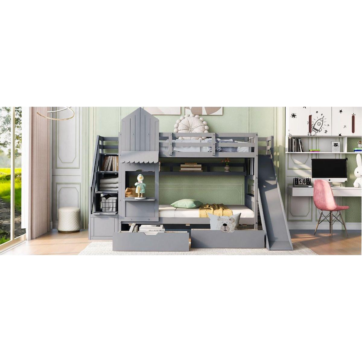 Twin-Over-Twin Castle Style Bunk Bed with 2 Drawers 3 Shelves and Slide - Gray