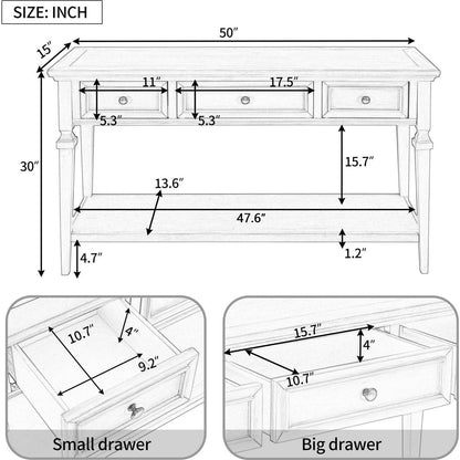 The part of the drawers is of limited height, the overall design of this console table is compact. in that case, the bottom shelf got large space to accommodate plenty of daily supplies. The load-bearing capacity of the bottom shelf is 66 lbs, and the amount can bear most things in your daily life. The bearing weight of each drawer is 17 lbs, and suitable for files or books, or some tools. Flat tabletop is a perfect place to support decorations and lamps, the load-bearing capacity of tabletop is up to 220 lbs.