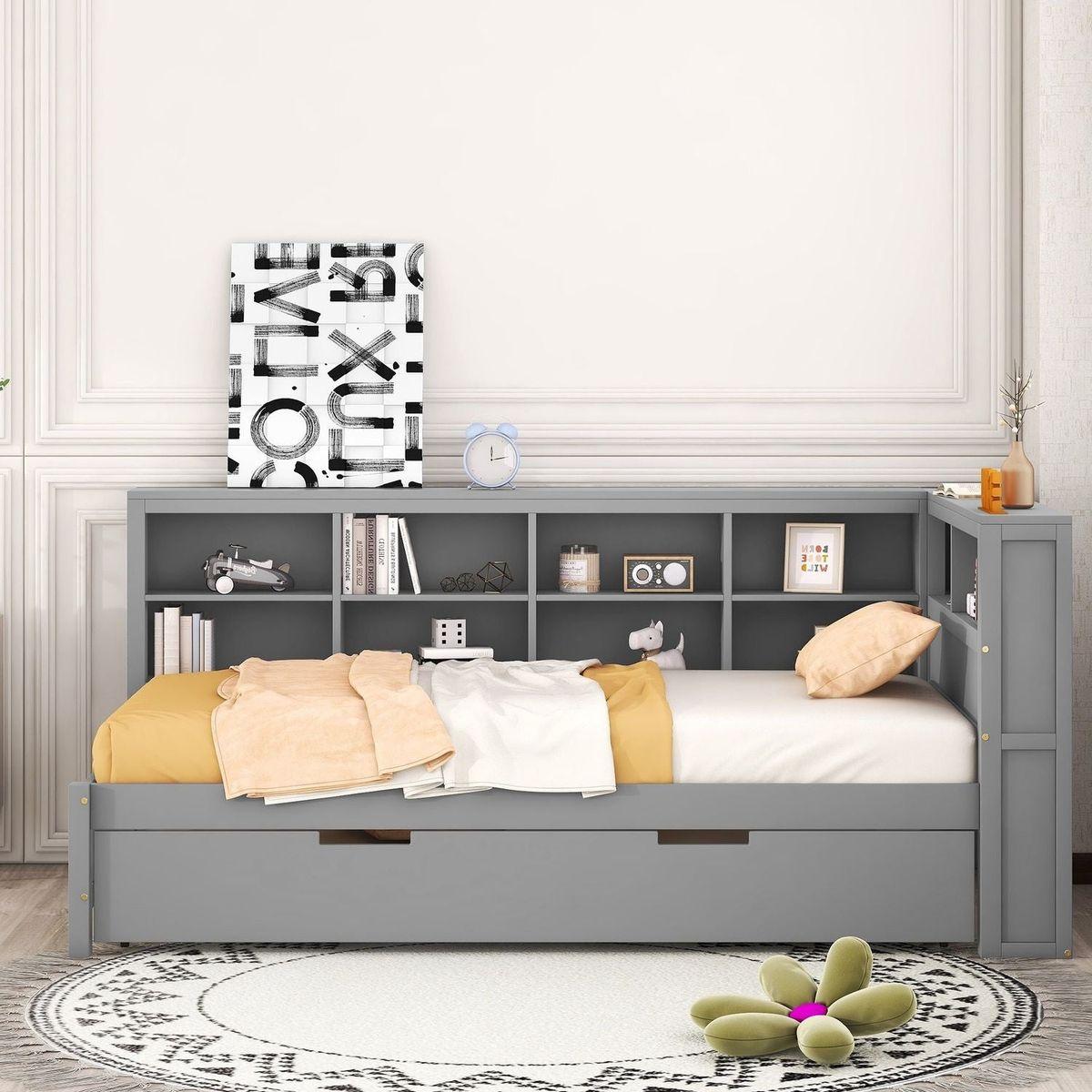 - Space-saving:The daybed includes one trundle, which can be rolled out to provide extra sleeping space. This design is ideal for families with children or users who need to host guests frequently. There is a double-layer storage shelf next to the bed, where users can store bedding, toys and other items.