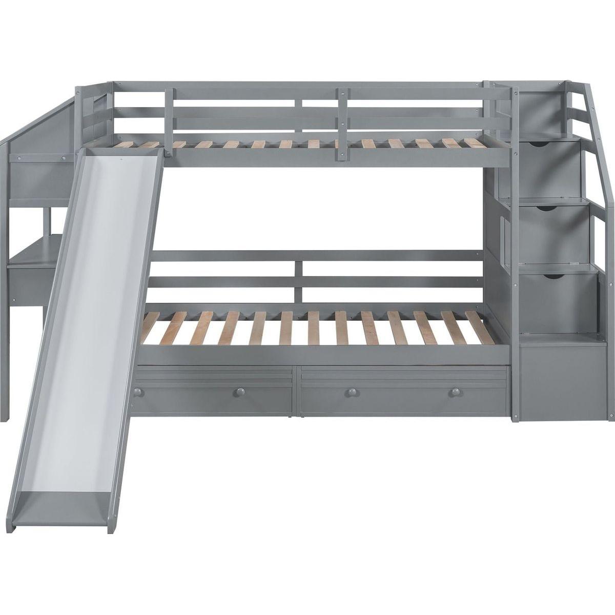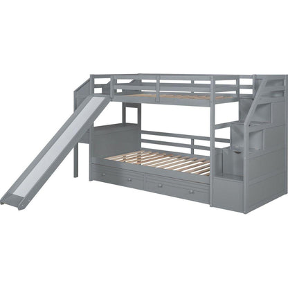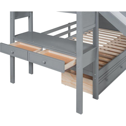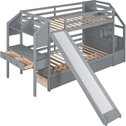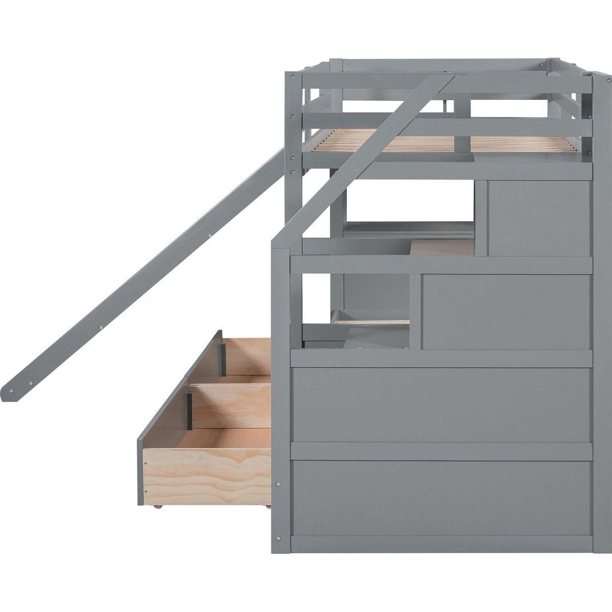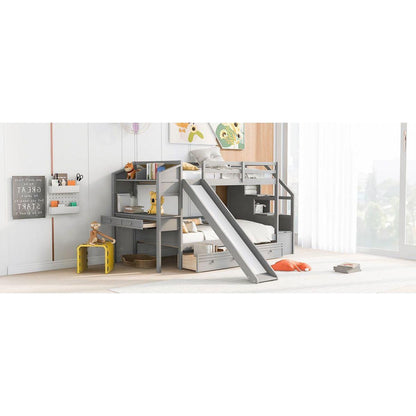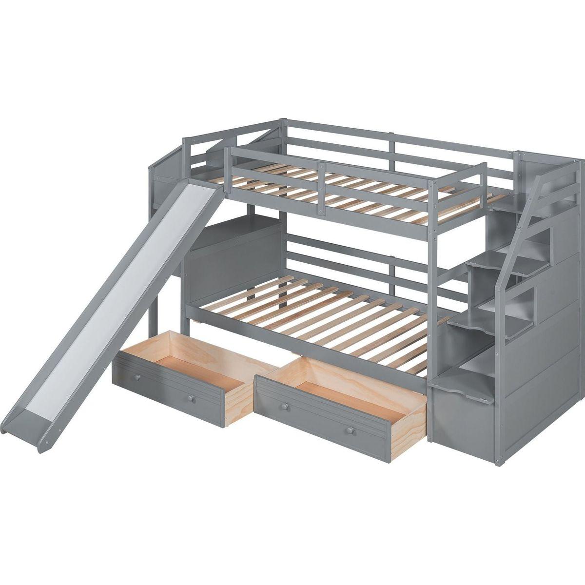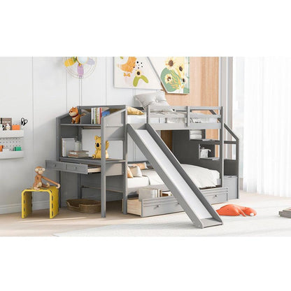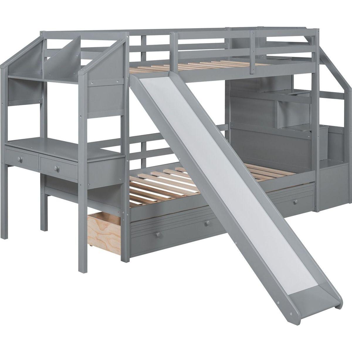 Twin over Twin Bunk Bed with Storage Staircase, Slide and Drawers, Desk with Drawers and Shelves, Gray