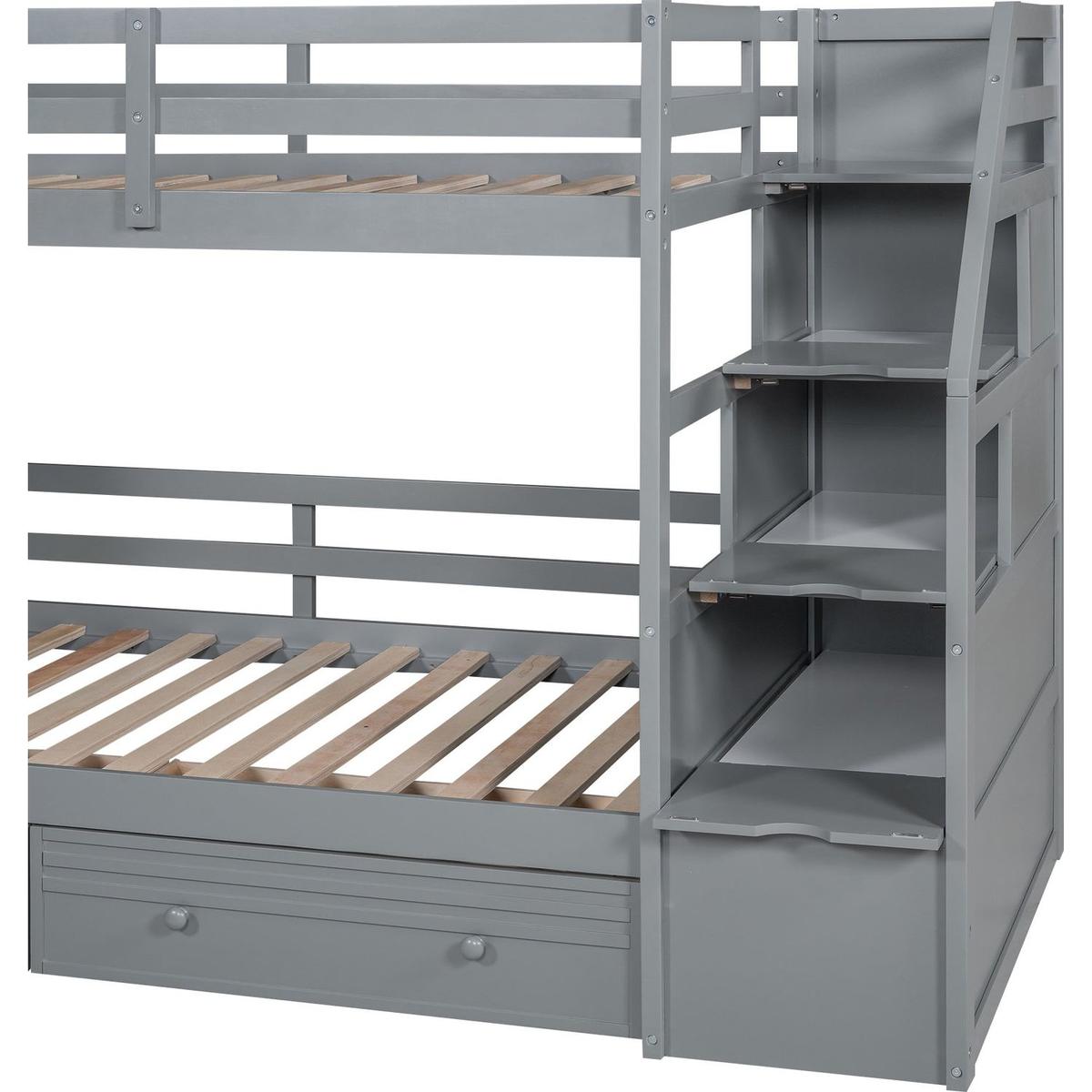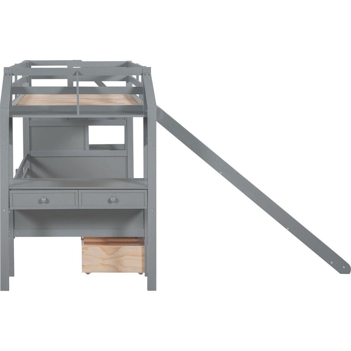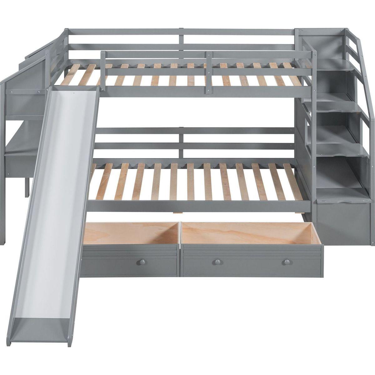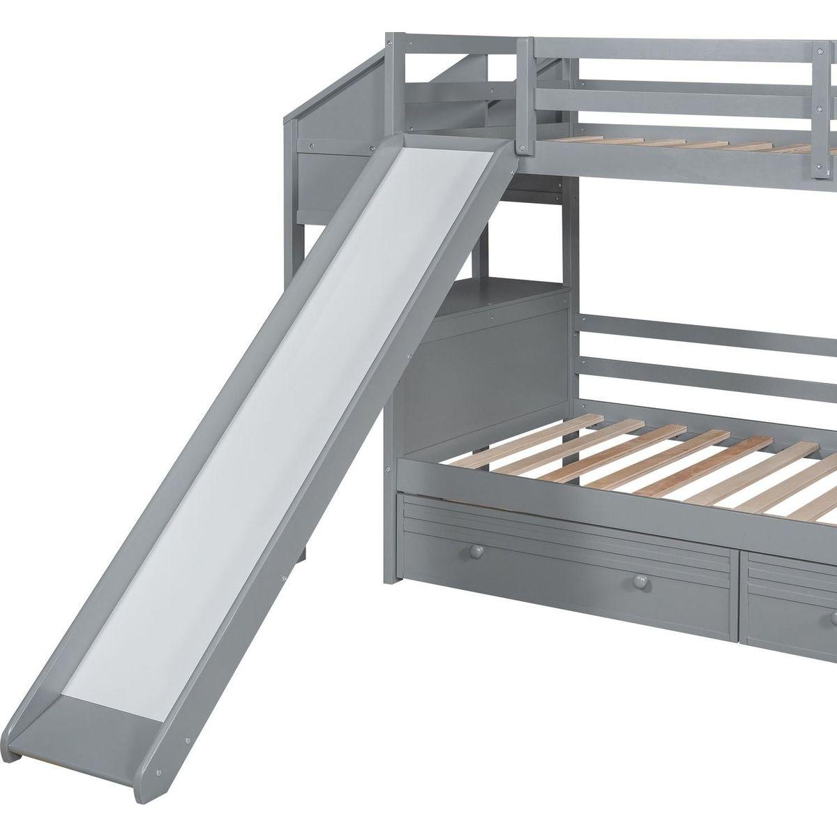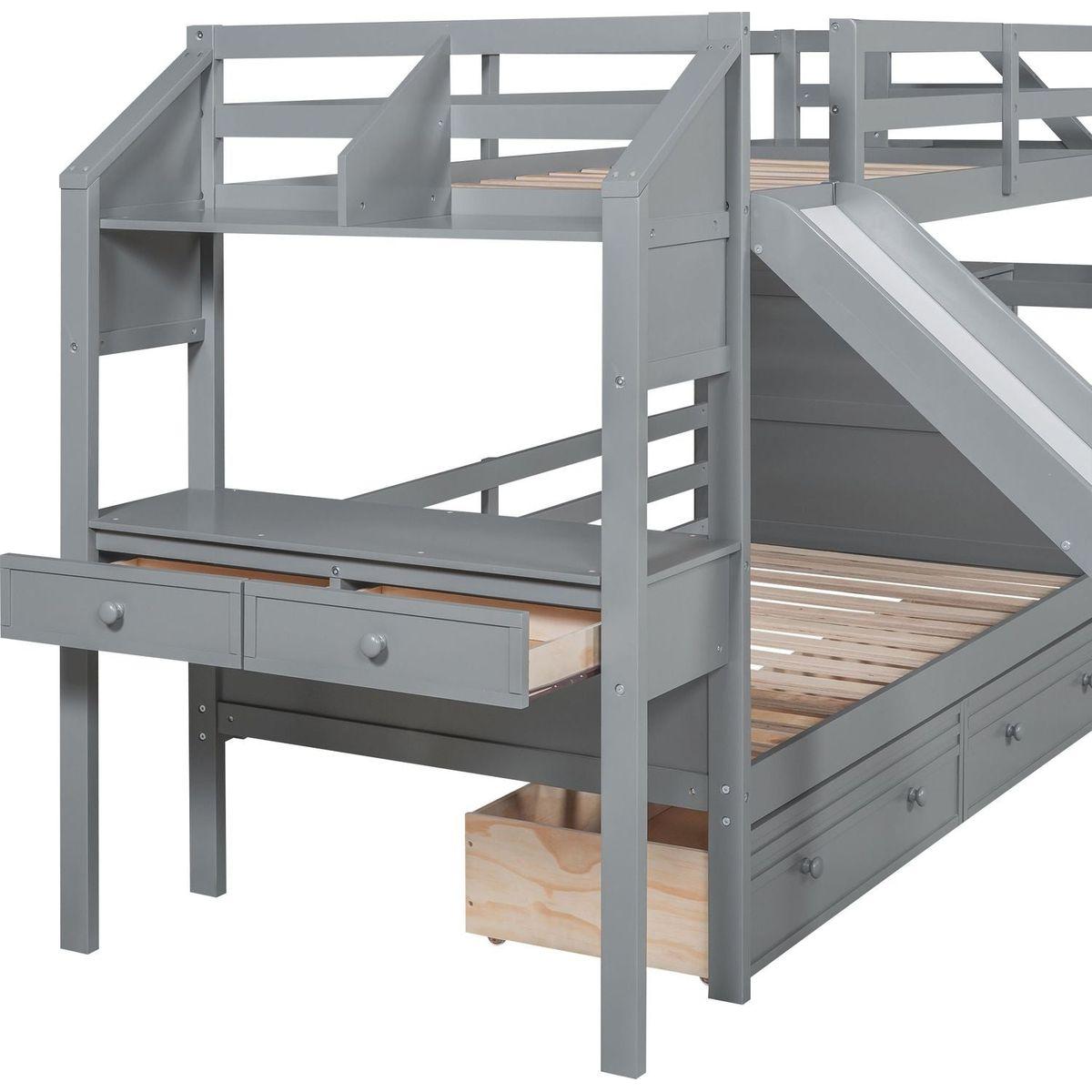Twin over Twin Bunk Bed with Storage Staircase, Slide and Drawers, Desk with Drawers and Shelves, Gray