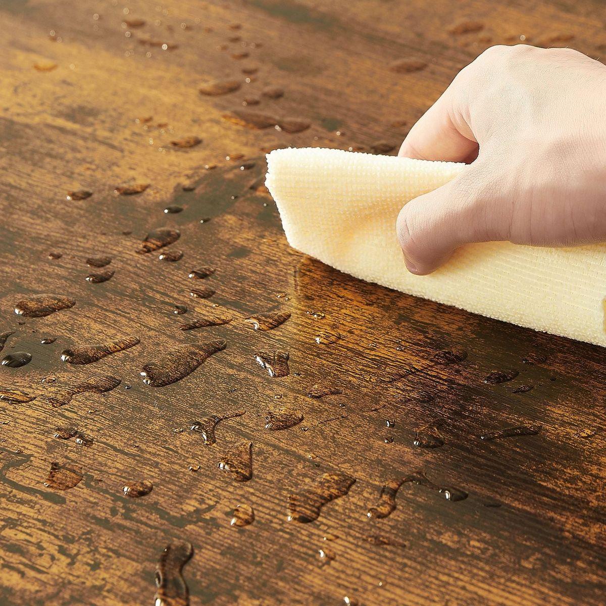 A rustic tabletop with vintage woodgrain mixes classic and modern elements to provide a place to relax.