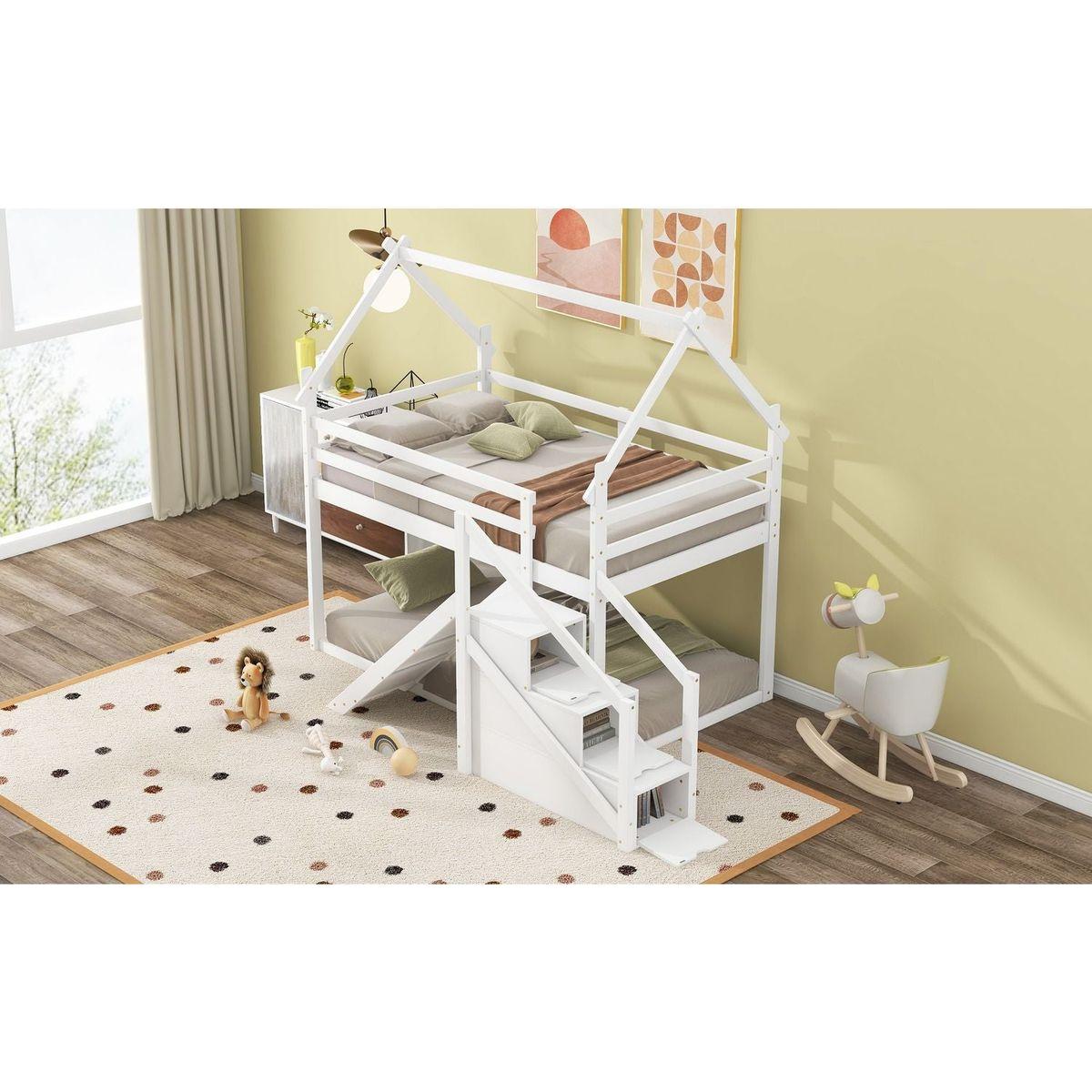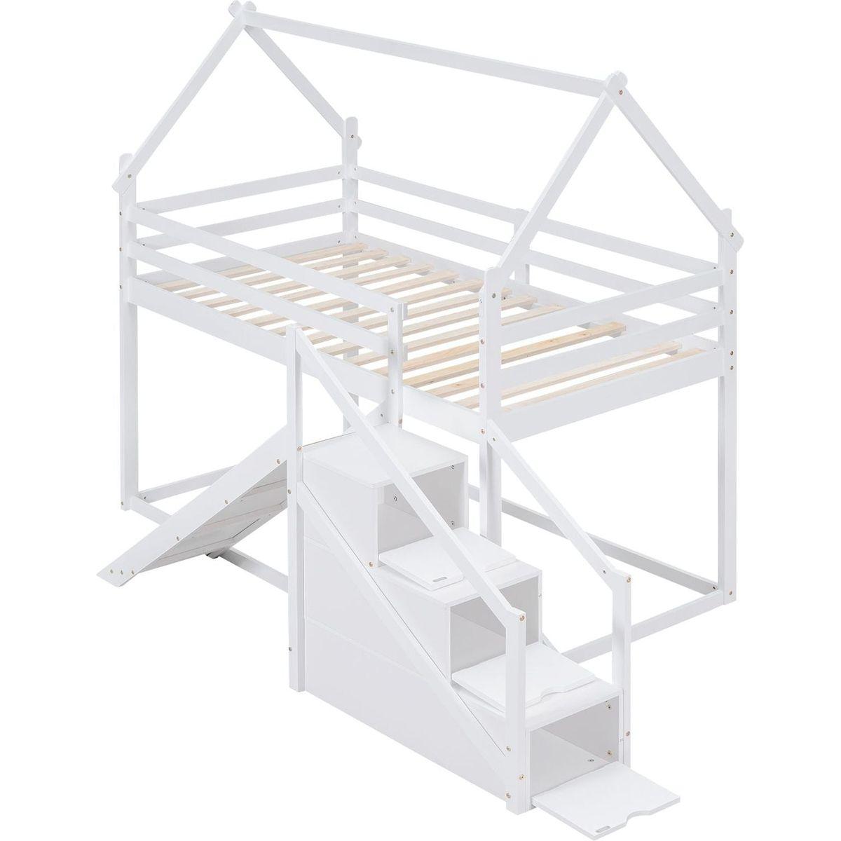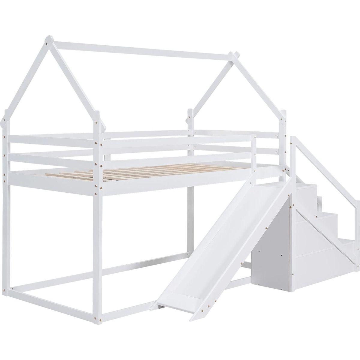 Twin over Twin House Loft or Bunk Bed with Slide and Staircase, White