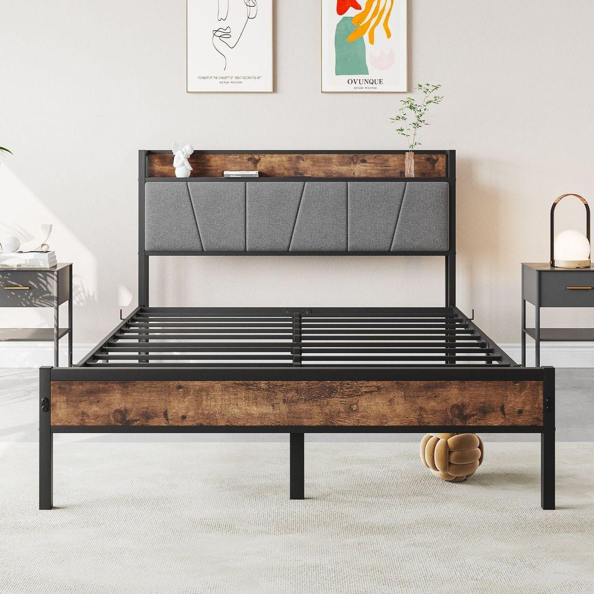 Full Size Bed Frame, Storage Headboard with Charging Station, Solid and Stable, Noise Free, No Box Spring Needed, Easy Assembly,Vintage Brown and Gray
