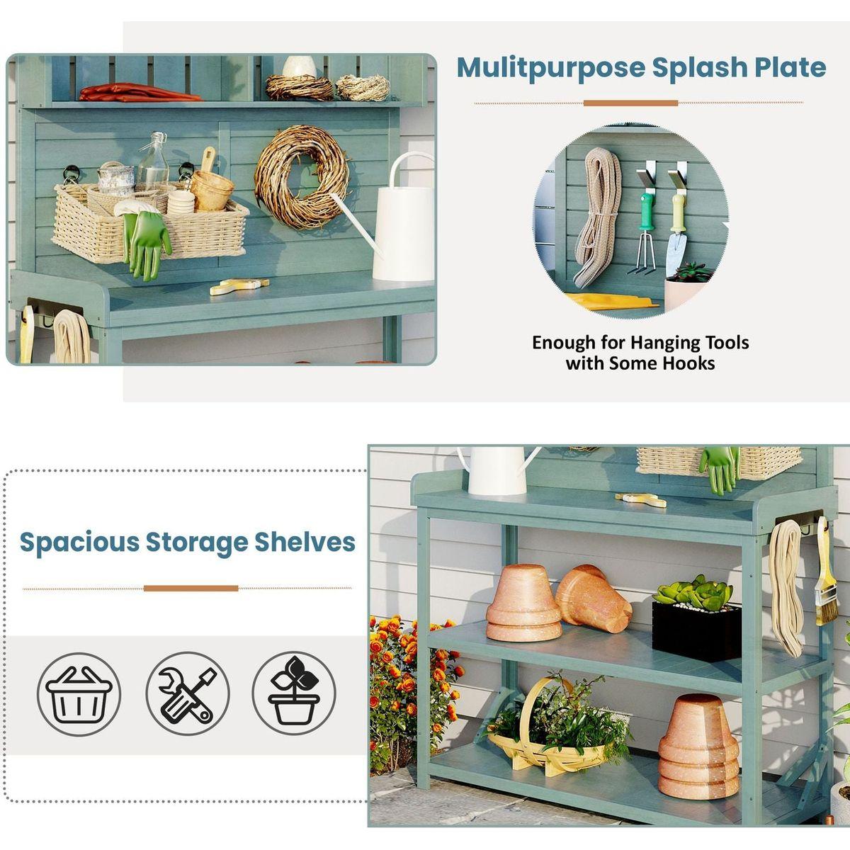 - [Splash Plate& Side Hook] There are always many small kits when gardening such as hand trowels, rakes, transplanters, towels, gloves and, of course, your farmer's hats. Just with some nails, the splash plate will become a board to hold your tools. Besides, the potting table comes with 3 hooks in the side which will make gardening easier.