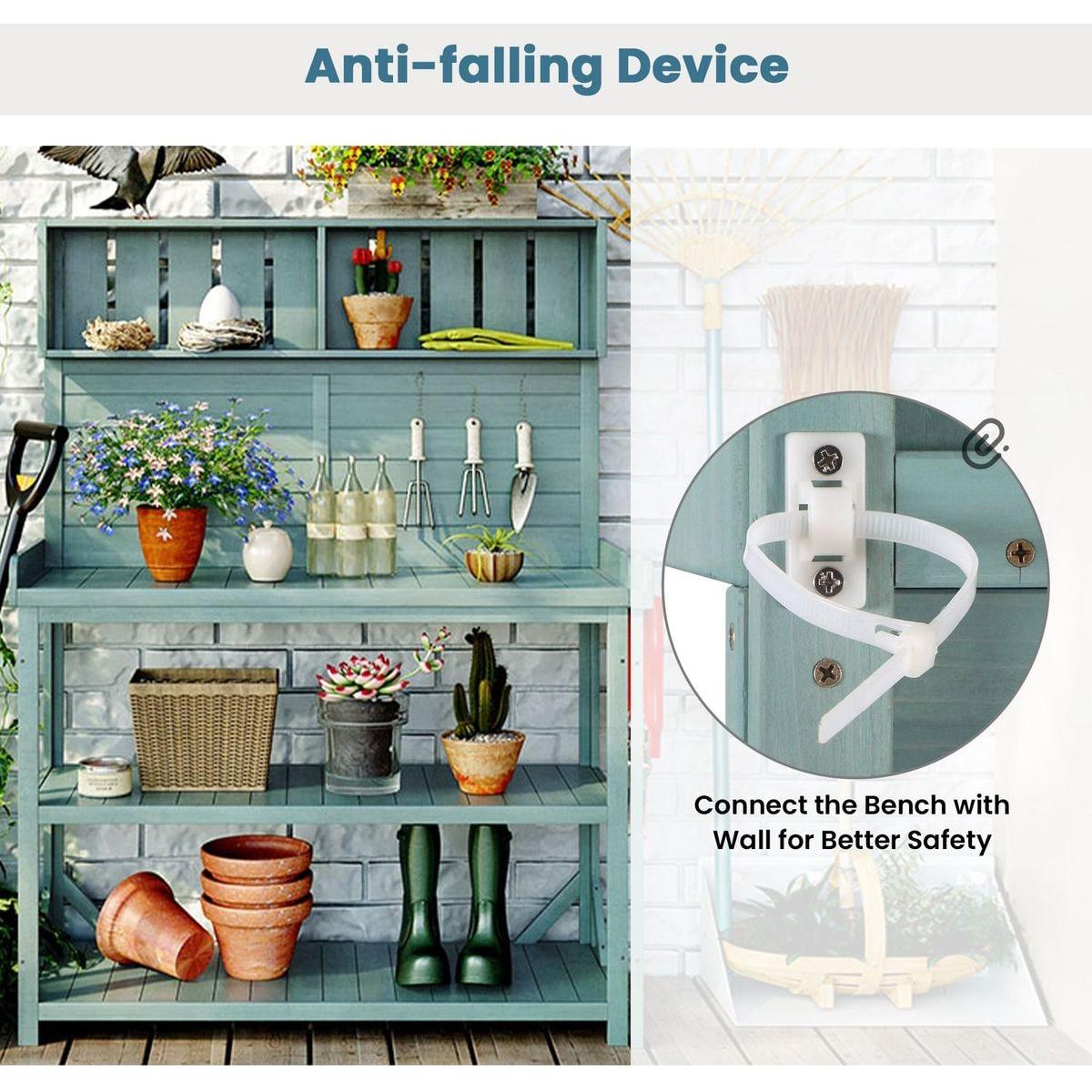 - [Anti-Falling Safety Device] There is not always flat in the garden. For your safety in setting the potting bench, it is designed with an anti-falling device. Just connect the device with wall for better safety. To strength stability, 4 supportive bars are offered to fixed in the lower shelves. They can be fixed in any corner until the table is stable.