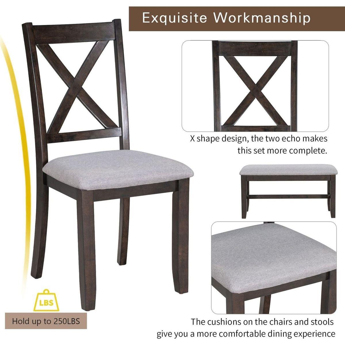 4. Exquisite Workmanship: it is worth noting that the table and chairs have X shape design, the two echo makes this set more complete. The X-shaped wooden strips on the side of the table have grooves to increase the beauty. The cushions on the chairs and stools give you a more comfortable dining experience