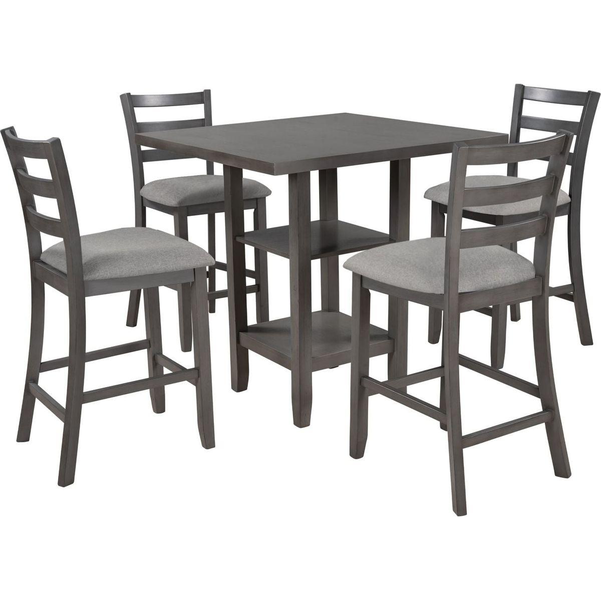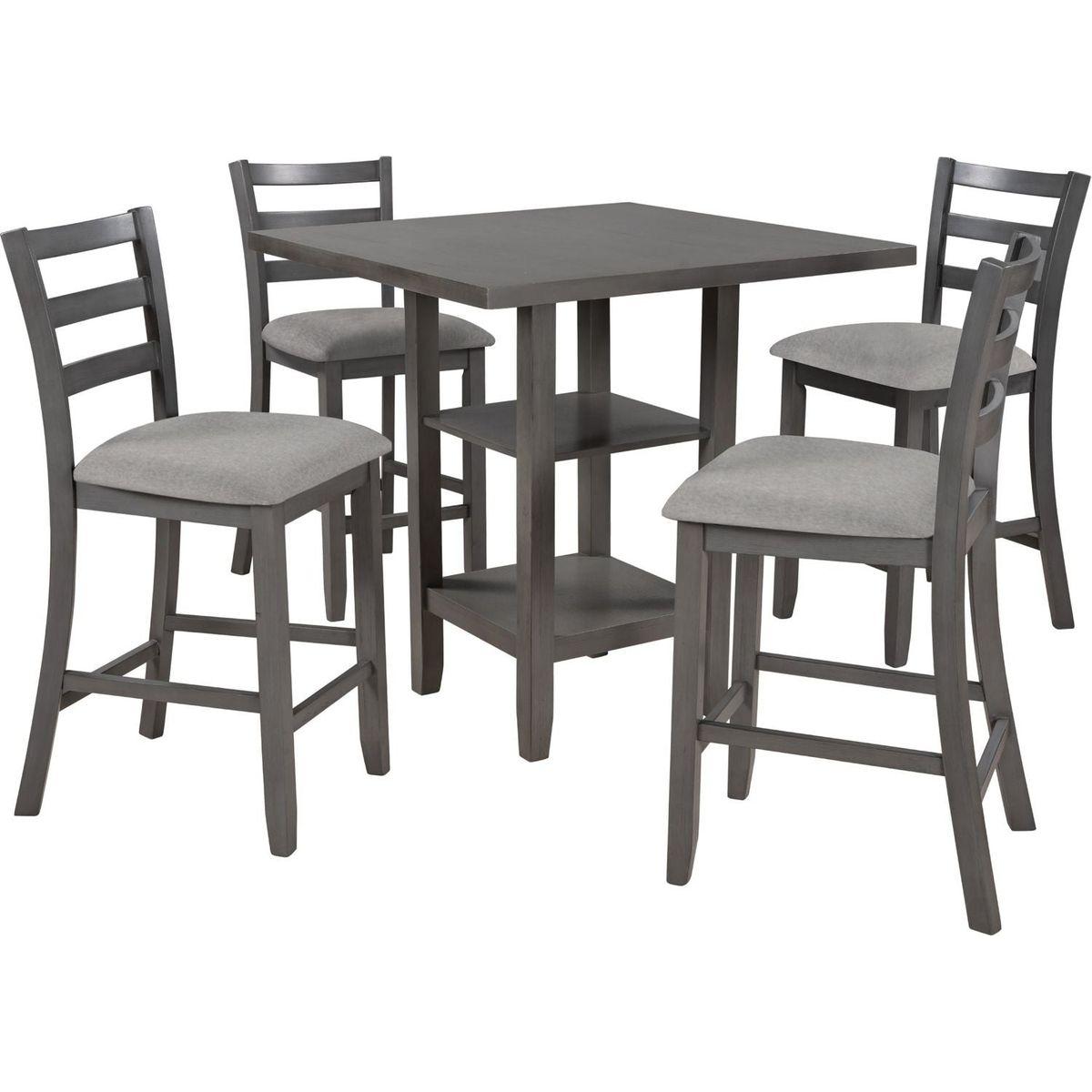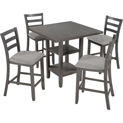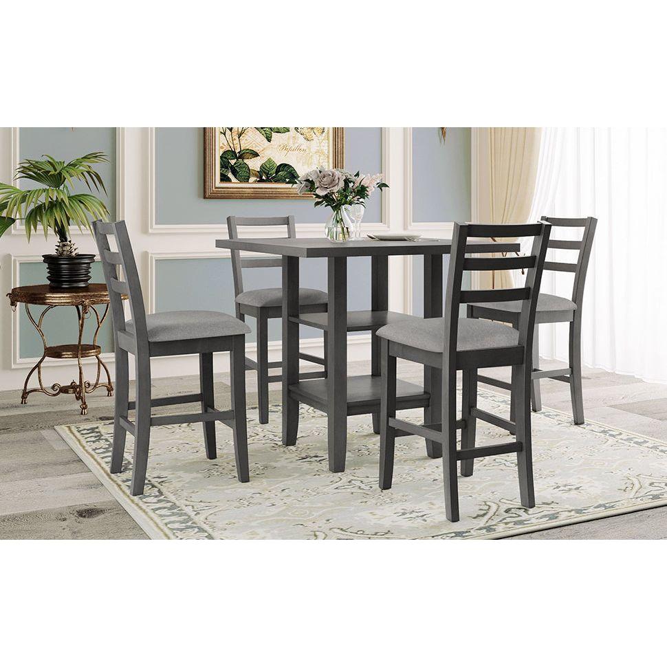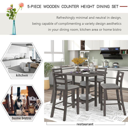 5-Piece Wooden Counter Height Dining Set with Padded Chairs and Storage Shelving (Gray)