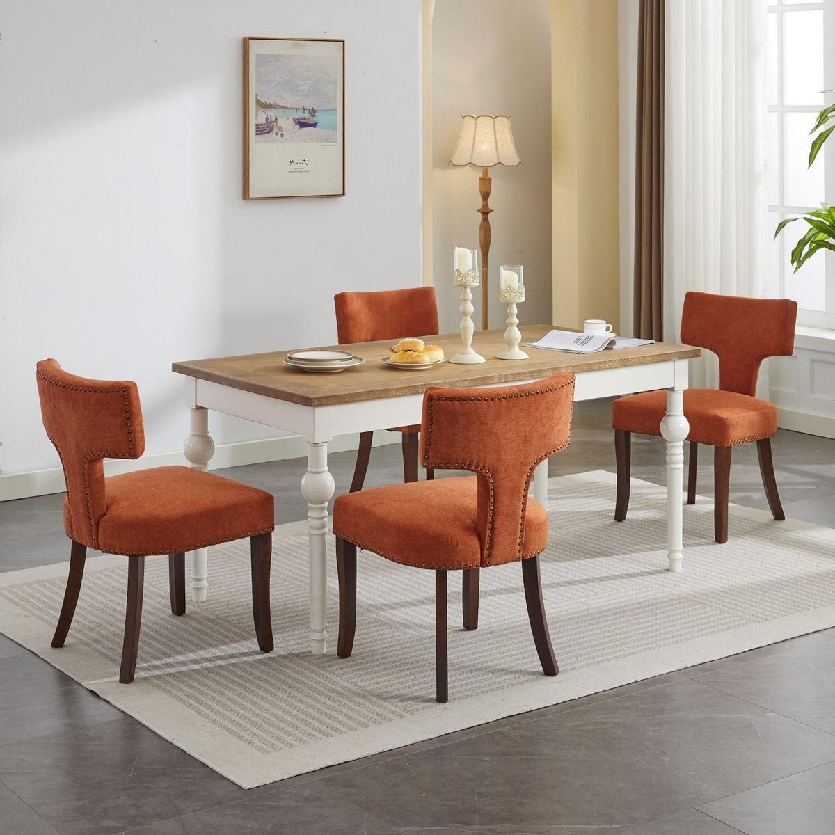 Mid Century Modern Dining Chairs Set of 2, Farmhouse Linen Fabric Upholstered Accent Chair Curved Backrest with Copper Nails around,Kitchen Chairs with Hardwood Frame, Orange