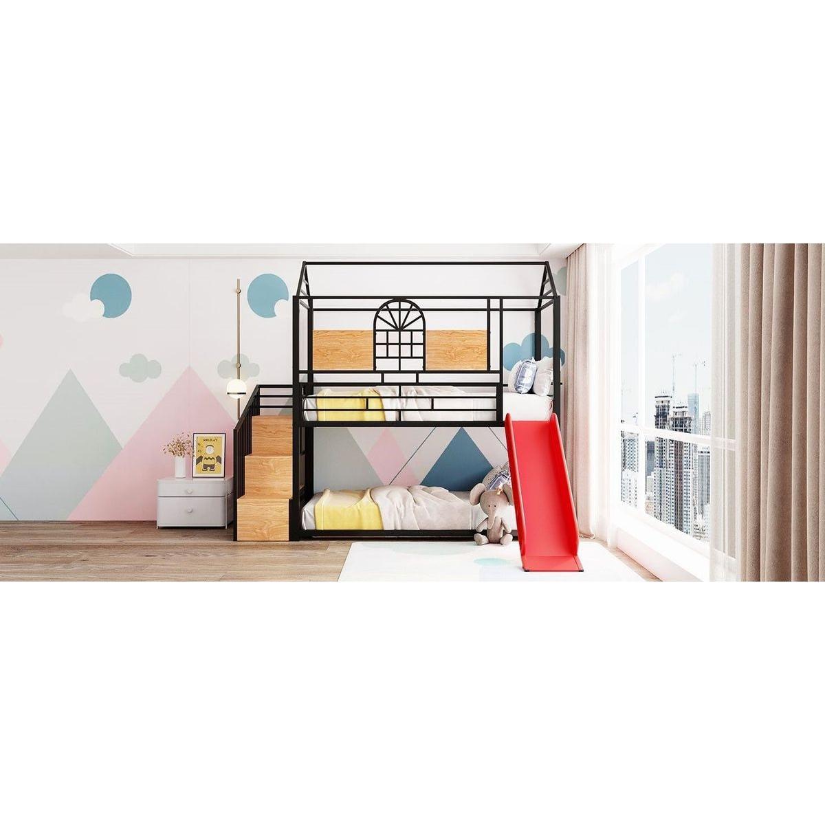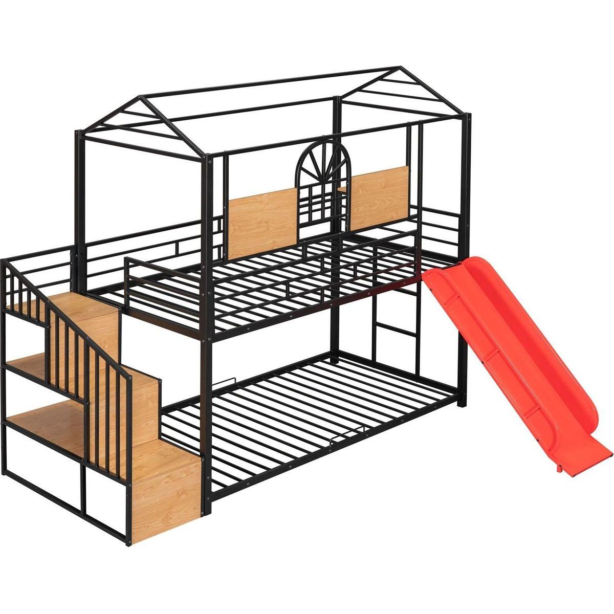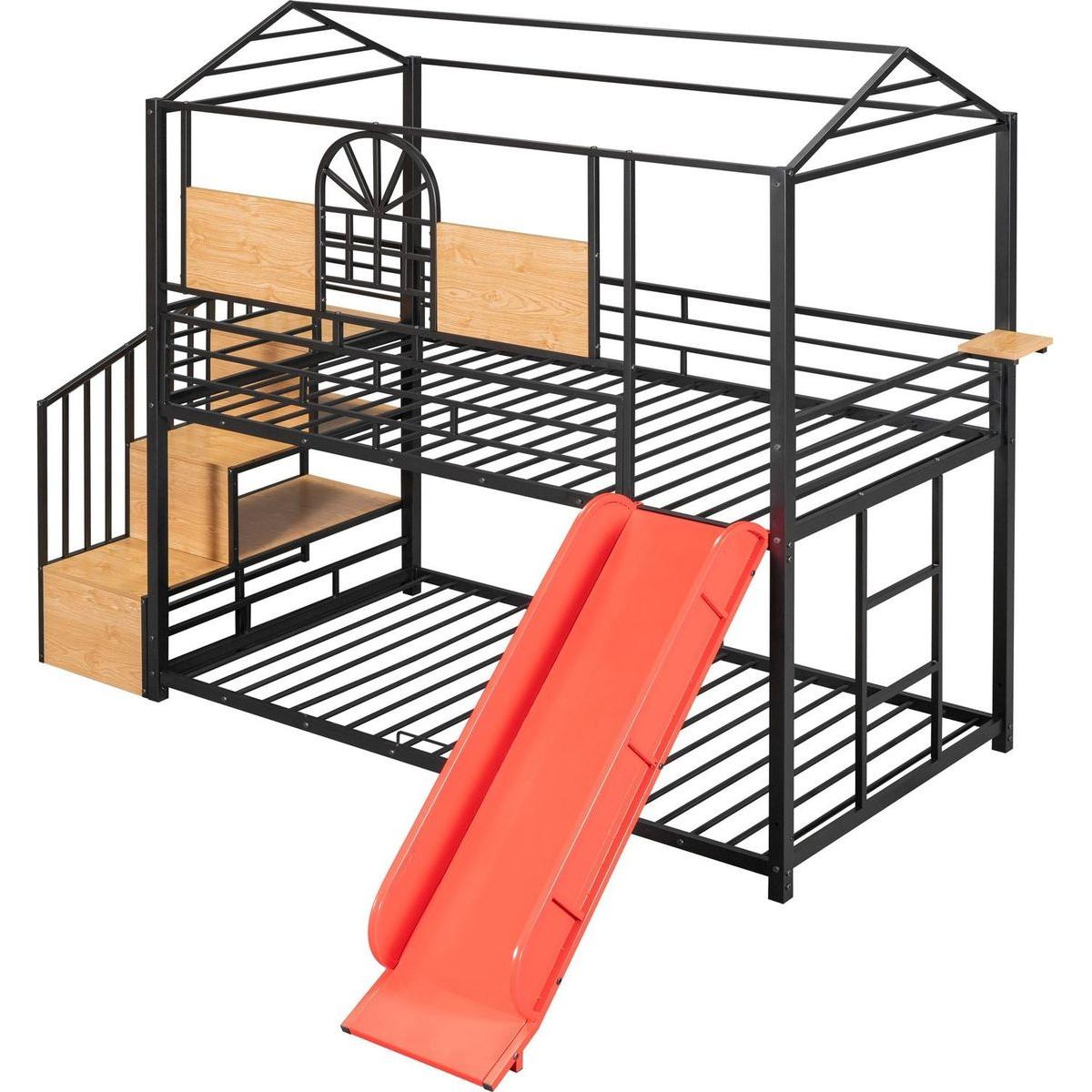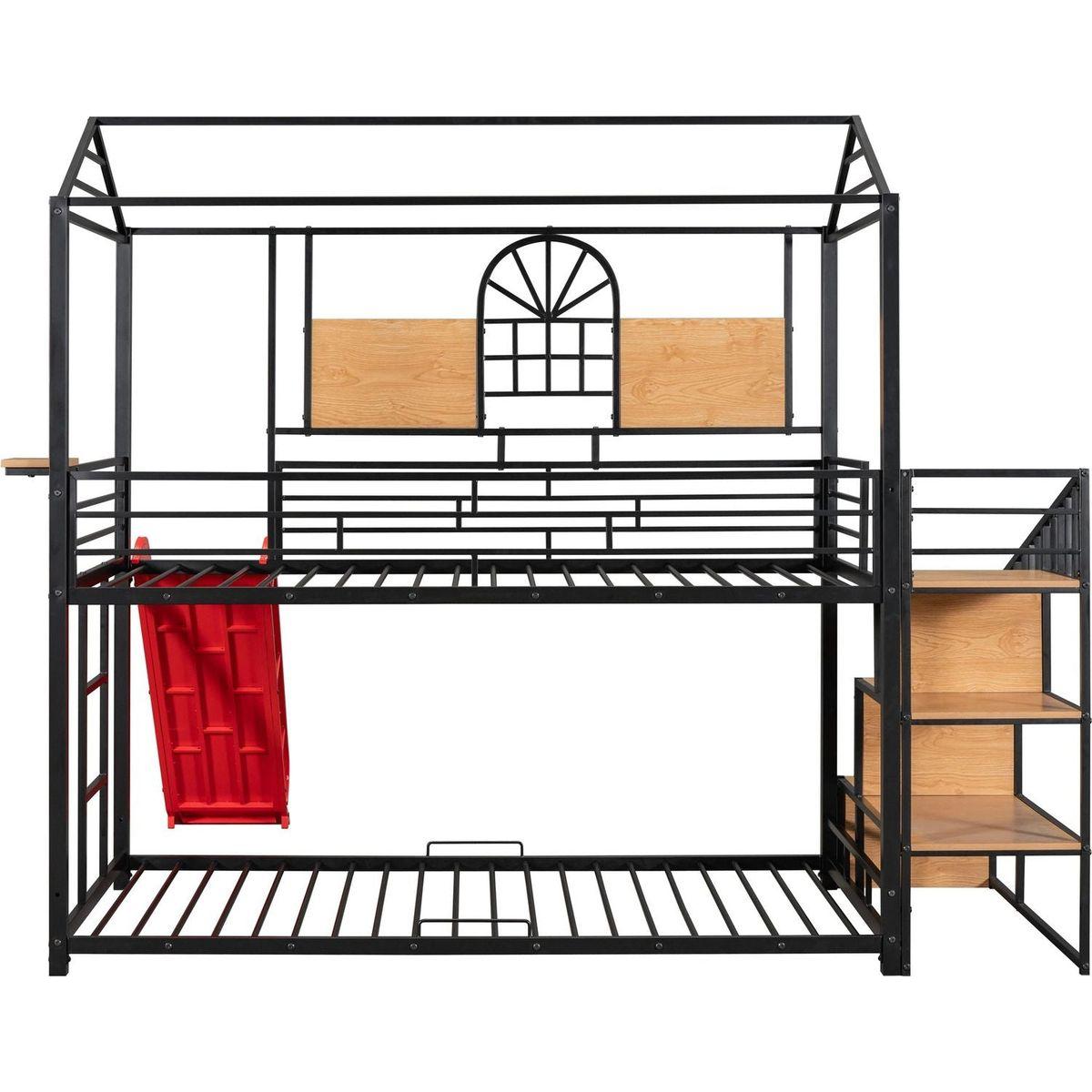 Twin Over Twin Metal Bunk Bed, Metal Housebed with Slide and Storage Stair, Black with Red Slide