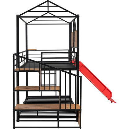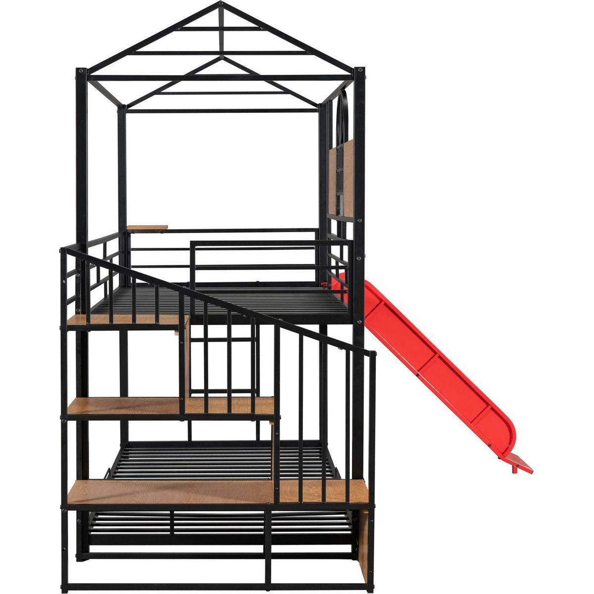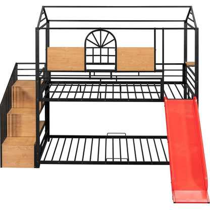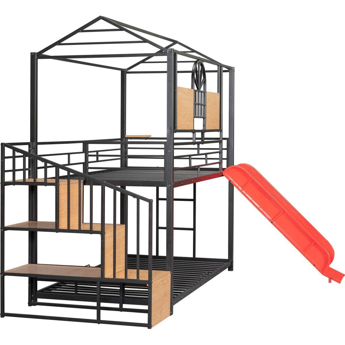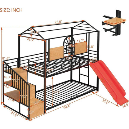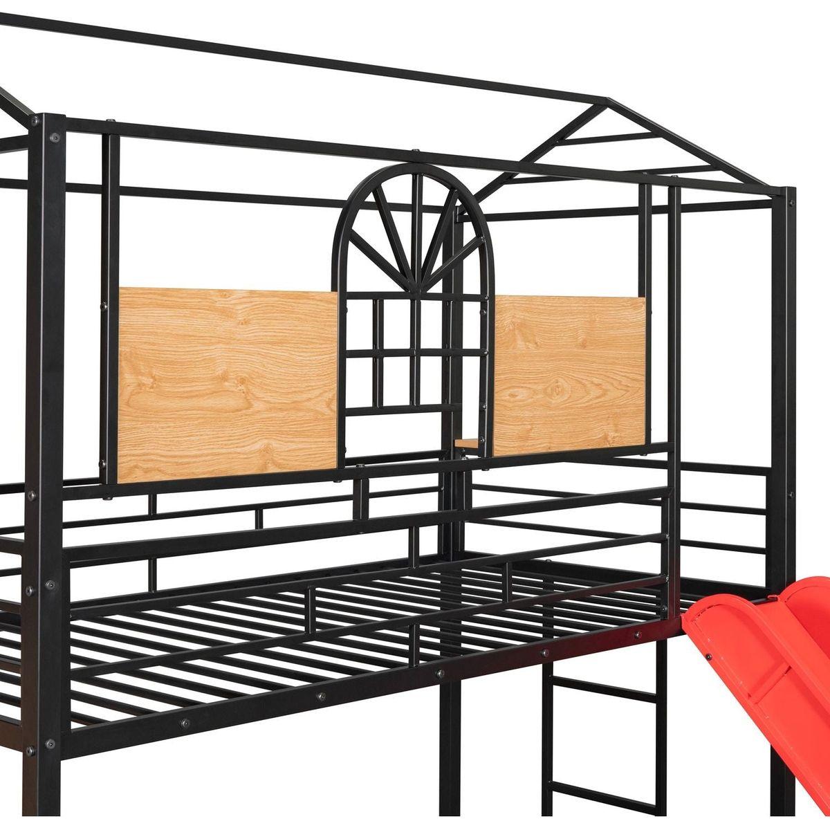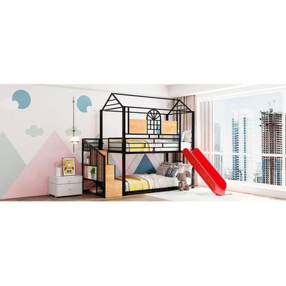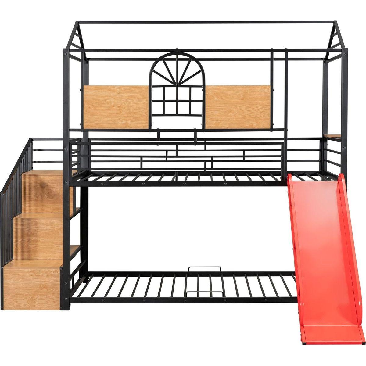 Twin Over Twin Metal Bunk Bed, Metal Housebed with Slide and Storage Stair, Black with Red Slide