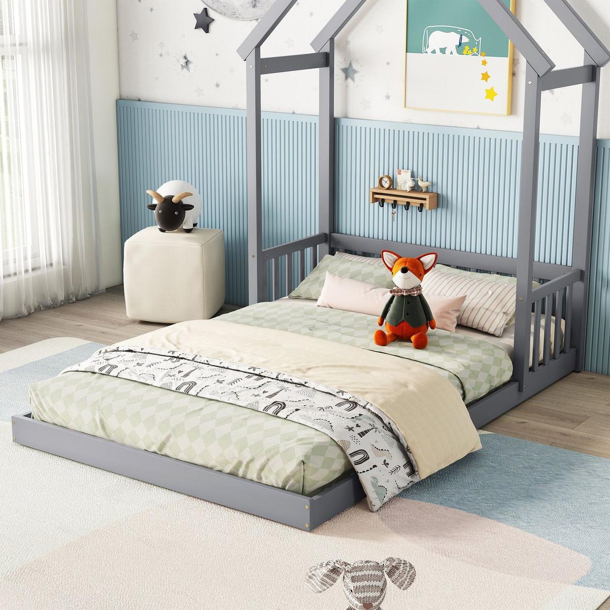 Full Roof-framed Headboard Floor Bed with Headboard Guardrails, without Slats, Grey