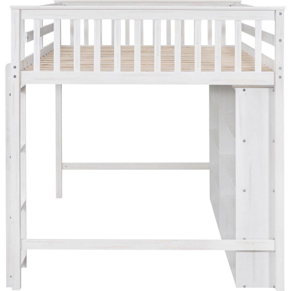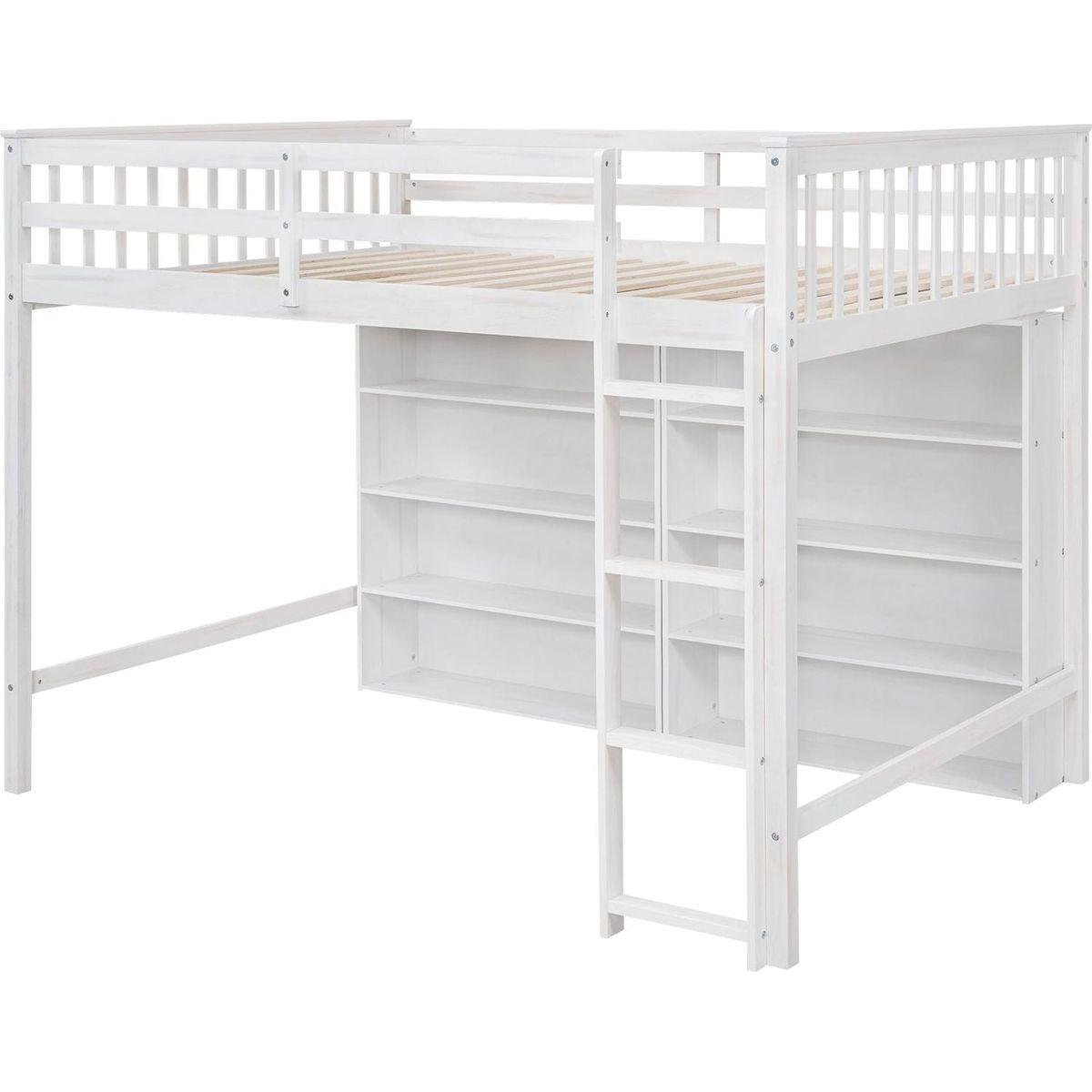 Full Size Loft Bed with 8 Open Storage Shelves and Built-in Ladder, White