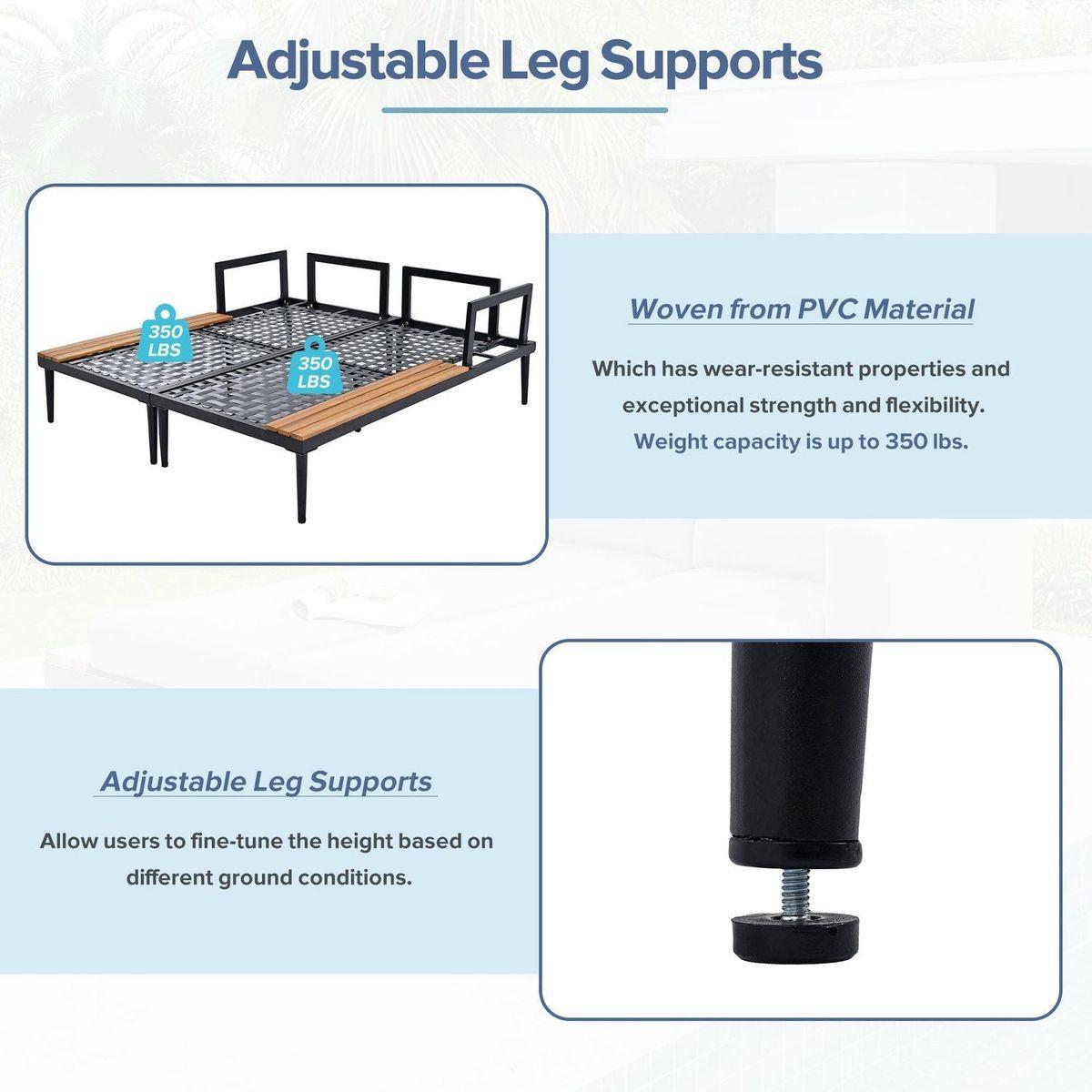 - [Adjustable Leg Supports] The base of this daybed is woven from PVC material, which has wear-resistant properties and exceptional strength and flexibility. Each individual daybed is reinforced by five sturdy iron leg supports and its weight capacity is up to 350 lbs. The adjustable leg supports allow users to fine-tune the height based on different ground conditions. The iron frame and iron legs ensure the stability and long-term use.